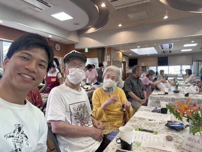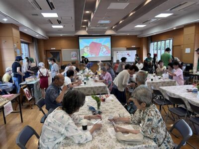 昼からは、片江公民館で開催された「カフェよりどころ」にお招きいただき、参加してまいりました。片江小学校の子どもたちが配膳のお手伝いをしてくれたり、「いるかワークさん(障がい者福祉事業)」によるクッキーの販売も行われておりました。