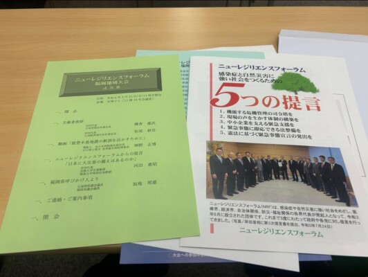 福岡市中央区にある天神ビルで開催されたニューレジリエンスフォーラム(NRF)に参加しました。このフォーラムは、感染症や自然災害に強い社会を目指し、医療界、経済界、自治関係、防災・福祉関係の各界代表が発起人となって、令和3年6月に設立された団体です。